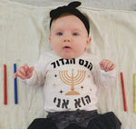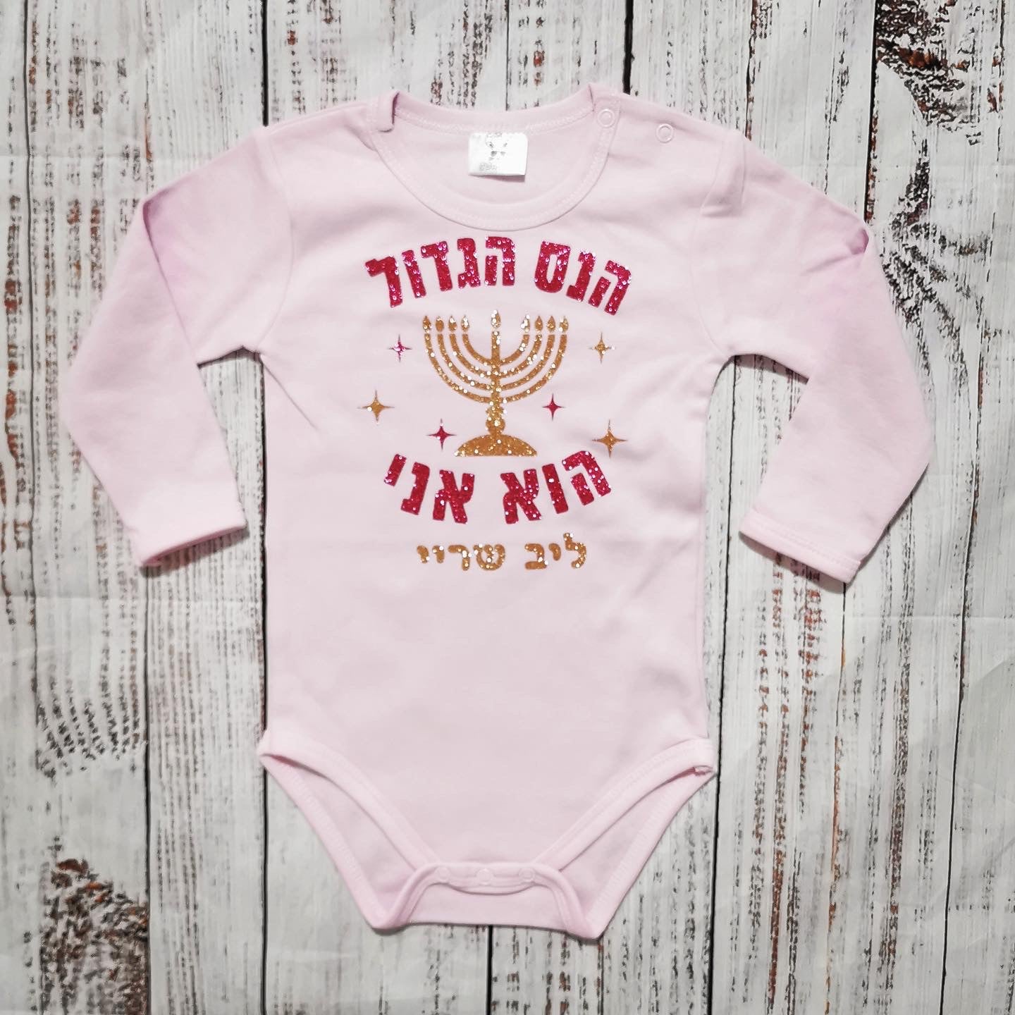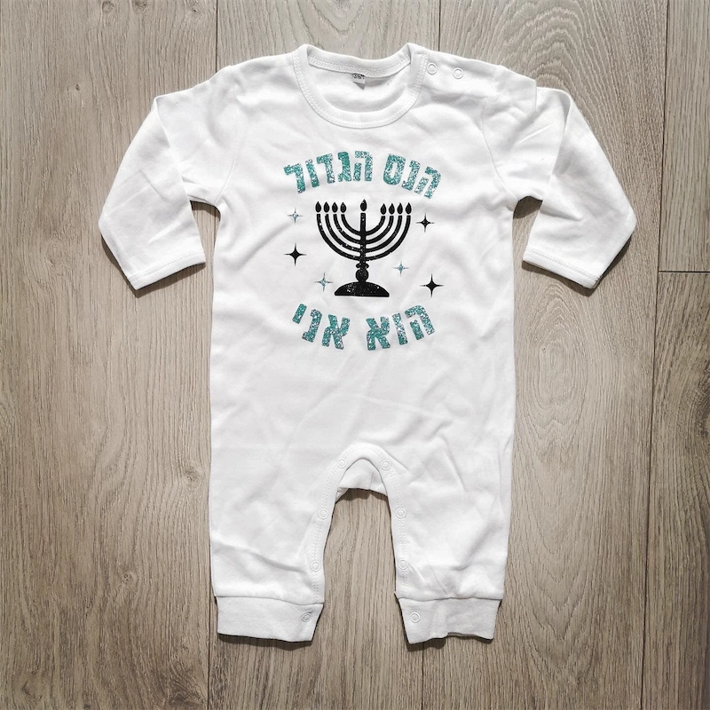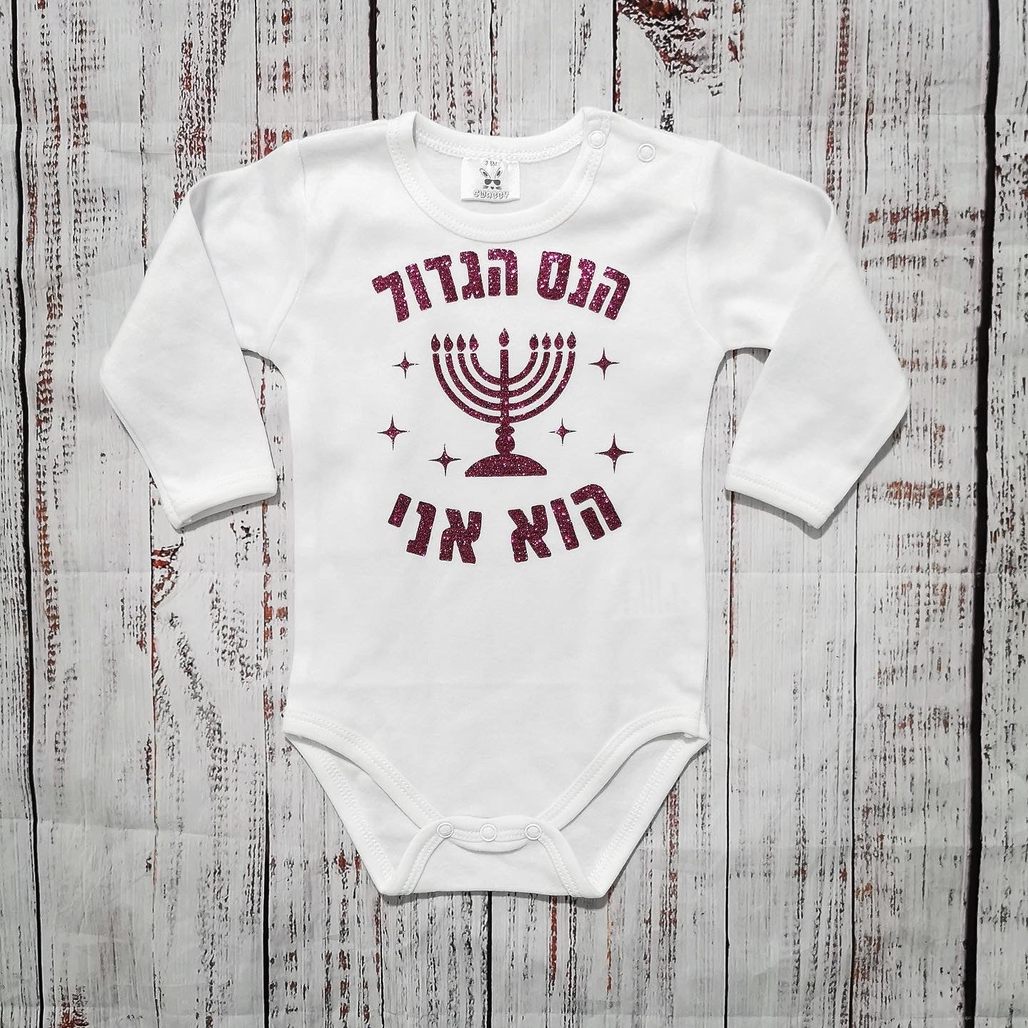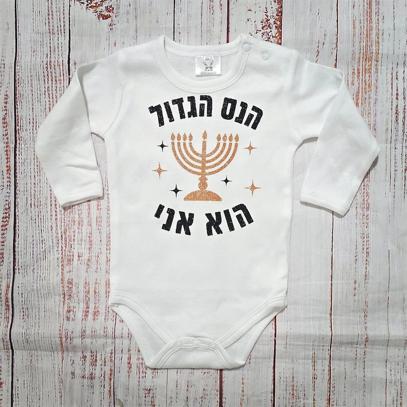 העיצוב "הנס הגדול הוא אני" הוא דרך עמוקה ומרגשת לחגוג את חג החנוכה, או כל יום אחר. הוא לוקח את המהות של החג - נס, אור ותקווה - והופך את הבייבי להתגלמות של כל אלה. זוהי הצהרה שמזכירה לכולם שהניסים הגדולים ביותר בחיים הם הילדים שלנו. כשהבייבי שלכם לבוש במסר העוצמתי הזה, הוא מביא איתו משמעות עמוקה לכל מפגש משפחתי. הוא לא רק חוגג את החג, הוא מסמל את הנס הפרטי והיקר שלכם. זהו רגע שמעורר התרגשות וגורם לכולם להעריך את המתנה היקרה מכל שהצטרפה למשפחה.