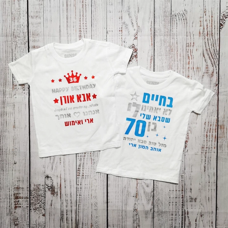 כדי להתאים את העיצוב לפרטים שלכם יש לבחור ולמלא את הפרטים כפי שאתם רוצים לעצב את הבגד. התמונות הן דוגמאות בלבד - הפרטים שתבחרו יופיעו על הבגד בדיוק כמו בעיצוב עצמו.