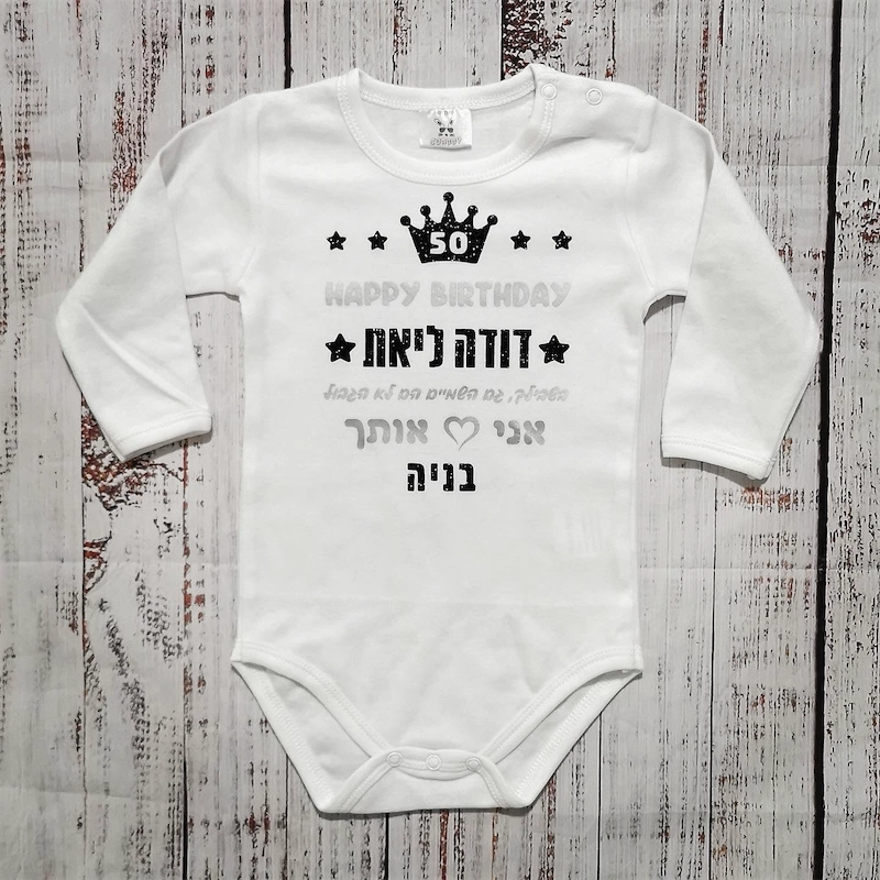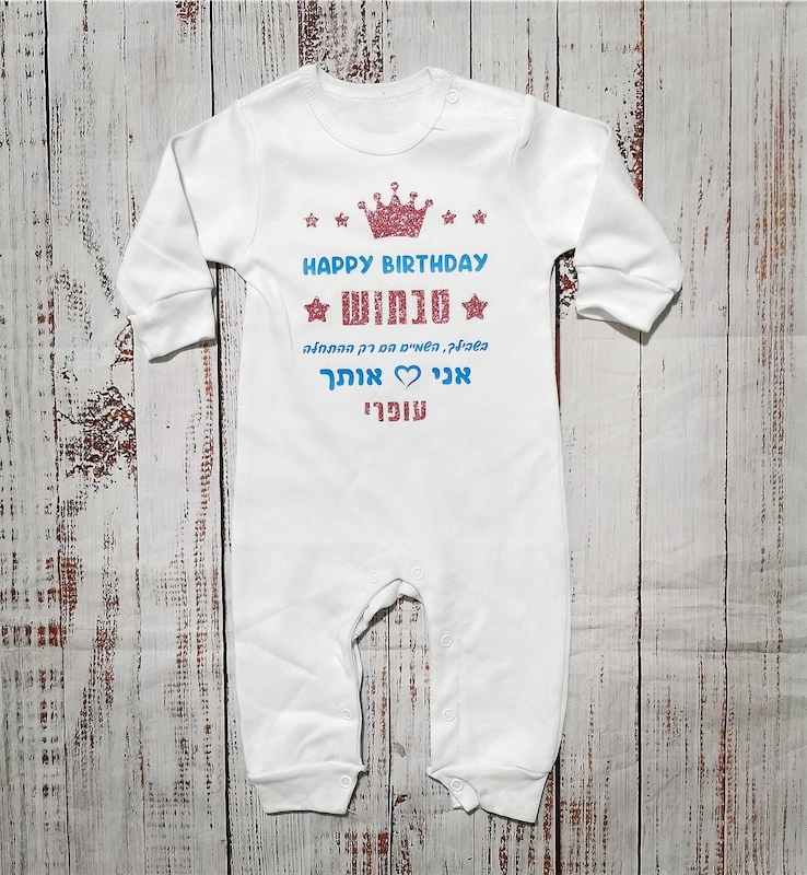 יש אנשים שפשוט חושבים אחרת. הם חולמים בגדול, פורצים דרכים, ולא נותנים לשום דבר לעצור אותם. הם האנשים שמעוררים בנו השראה, אלה שמראים לנו שאפשר להגיע רחוק יותר. בדיוק עבור האנשים המיוחדים האלה, שחיים בתדר אחר, יצרנו את העיצוב "גם השמיים הם לא הגבול". זו לא ברכת יום הולדת רגילה, זו הצהרת הערכה עמוקה. בין אם זה אבא יזם, אמא אמנית, דוד שטס בכל העולם או סבתא שהמציאה את עצמה מחדש בגיל 60. כשהבייבי שלכם מגיע לבוש במסר הזה, הוא בעצם אומר בשם כולכם: "אנחנו רואים את הגדולה שבך, מאמינים בך, ומקווים שתמשיך לעוף הכי גבוה שאפשר". זה רגע עוצמתי. מתנה כזו היא לא חומרית, היא רוחנית. היא נותנת דלק להמשיך לחלום, היא מחזקת את האמונה בעצמך, והיא מראה לאדם אהוב עד כמה הוא מהווה השראה לסביבה שלו. זה מסוג הרגעים שגורמים לאנשים להזדקף בגאווה, בידיעה שהאנשים הכי קרובים אליהם מבינים אותם באמת. וכדי שהמסר הגדול הזה יגיע בנוחות שיא, הבגד עצמו עשוי 100% כותנה ישראלית משובחת. הבד רך, נושם ונעים, ומאפשר לבייבי לנוע בחופשיות בזמן שהוא מעביר מסרים חשובים. הגזרה המדויקת והכפתורים הנוחים מבטיחים שהחוויה תהיה נעימה גם להורים. ההקפדה שלנו על איכות ממשיכה גם בהדפסה. כל הדפסה של העיצוב המיוחד הזה נעשית אצלנו בסטודיו בעבודת יד, מתוך מחשבה על המסר שהיא נושאת. אנו משתמשים בצבעים איכותיים שמבטיחים שההדפס יישאר ברור וחד, כתזכורת תמידית לכך שאין גבולות לחלומות, לאהבה וגם לאיכות. בסופו של דבר, זו מתנה שהיא הרבה יותר מבגד. זו מחווה של אמונה, דרך ייחודית להגיד לאדם אהוב - "תמשיך להיות מי שאתה, כי אתה השראה לכולנו".