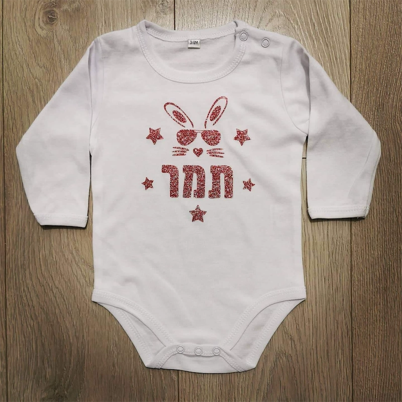 העיצוב הזה הוא חתימת הסטייל הייחודית של המותג שלכם, בהתאמה אישית מושלמת. הוא משלב את הדבר הכי אישי שיש - שמו של הילד - עם איור ה"סוואגי" המזוהה אתכם, ויוצר פריט שהוא גם אישי וגם מצהיר על שייכות למשפחה עם סטייל וביטחון. כשהבייבי לבוש בבגד הזה, הוא לא רק עונד את שמו, הוא עונד מותג. הוא הופך לשגריר הקטן והמגניב ביותר שלכם. זוהי מתנה מושלמת להורים שאוהבים את האופי הייחודי שלכם ורוצים להעניק לילדם פריט שהוא באמת אחד ויחיד, עם קריצה אופנתית.