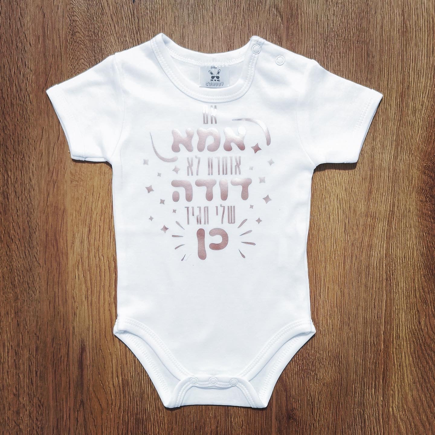 העיצוב הזה הוא הצהרה משעשעת שמגדירה במדויק את אחד החוקים הלא-כתובים והאהובים ביותר בכל משפחה. הוא חוגג את דמותה של הדודה המפנקת, זו שתמיד נמצאת שם כדי להפר את הכללים באהבה, ולהיות השותפה המושלמת לכל הרפתקה קטנה. כשהבייבי לבוש במסר הקונדסי הזה, הוא הופך לשגריר של הברית הסודית והמתוקה בינו לבין דודתו. זהו רגע של צחוק והזדהות שגורם לדודה להתמלא בגאווה על תפקידה המיוחד, ומזכיר לאמא בחיוך מי אחראית על כל הפינוקים.