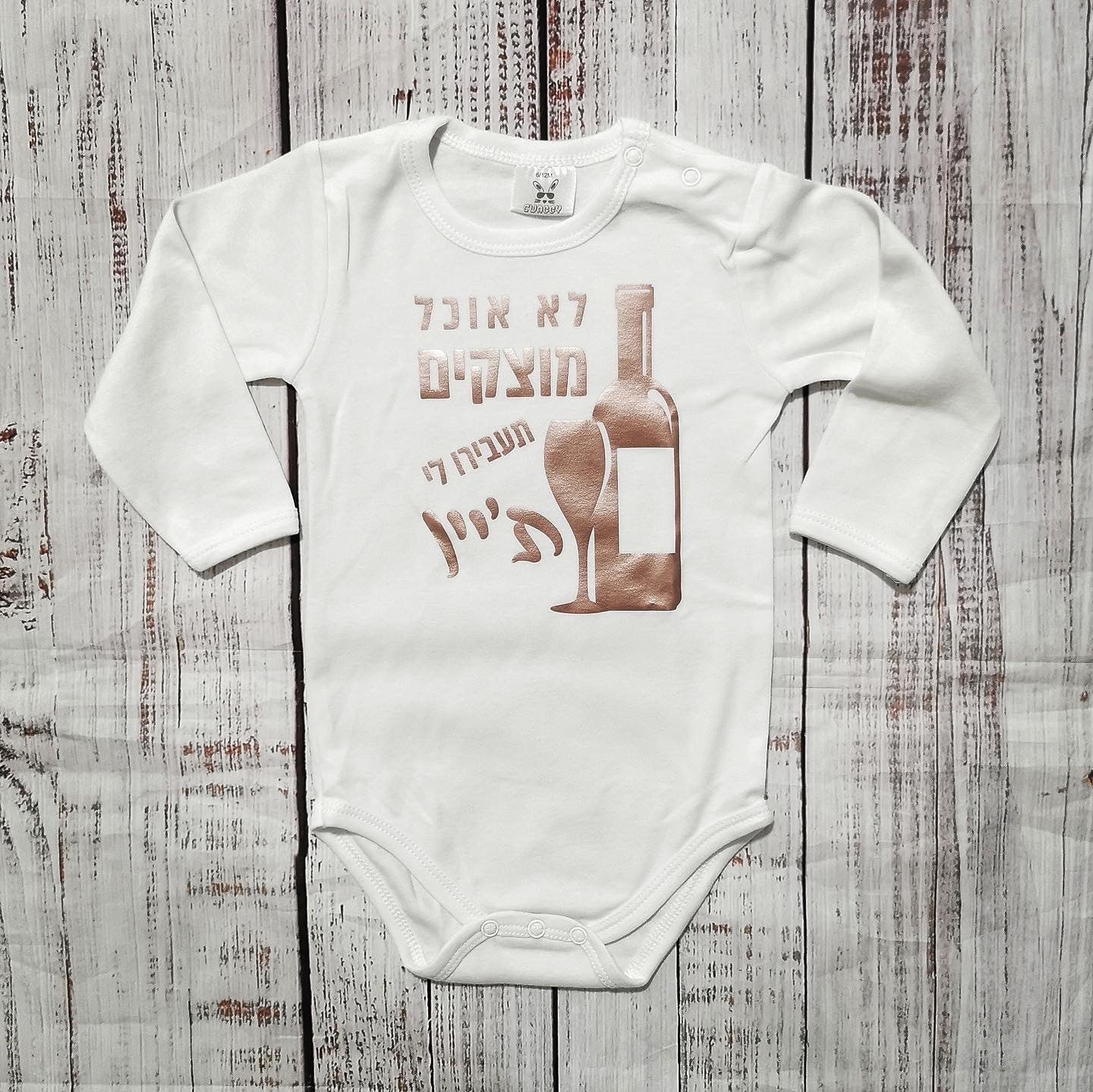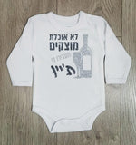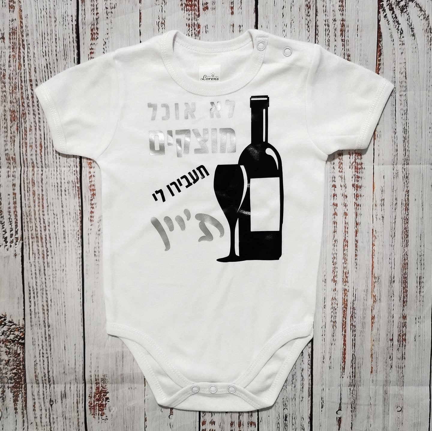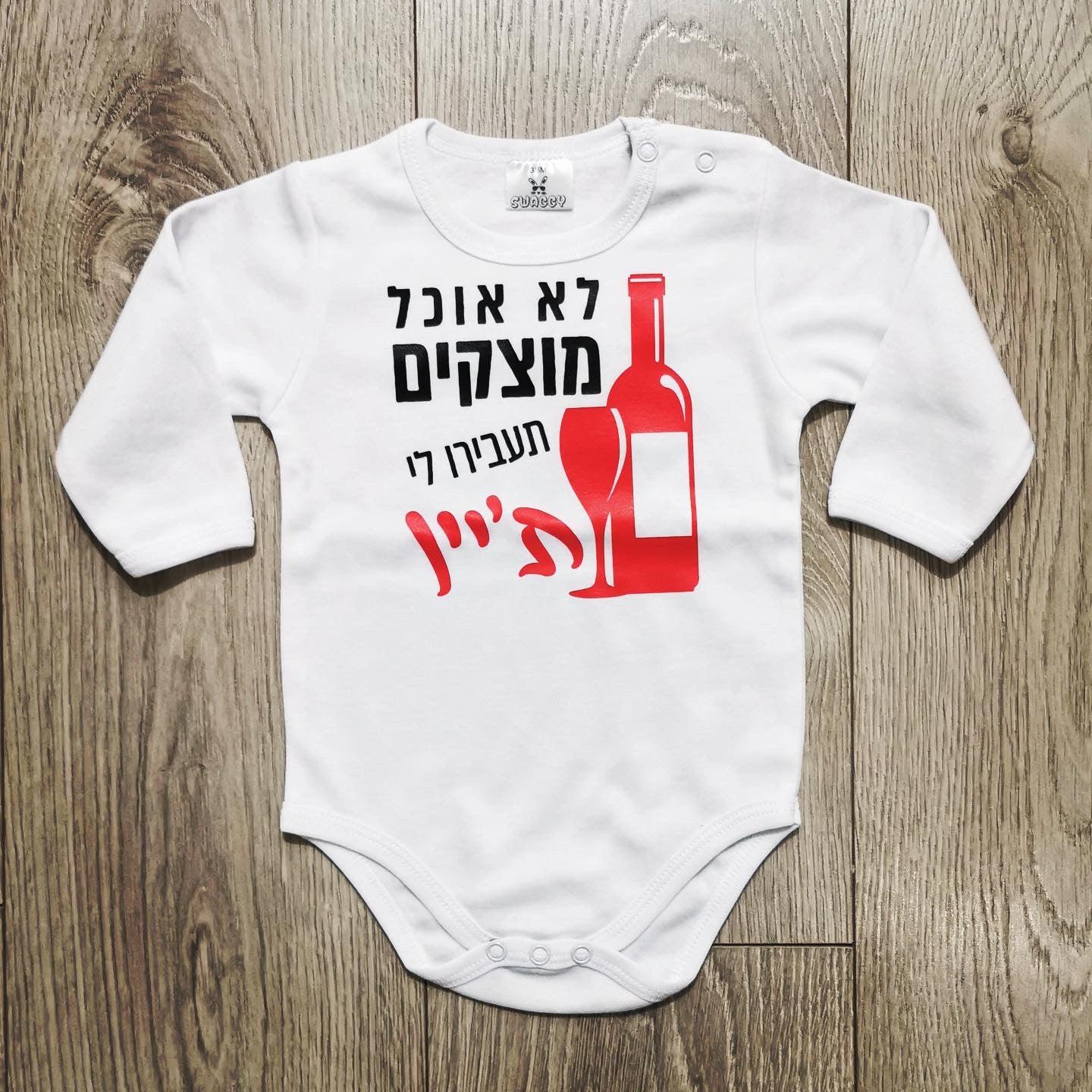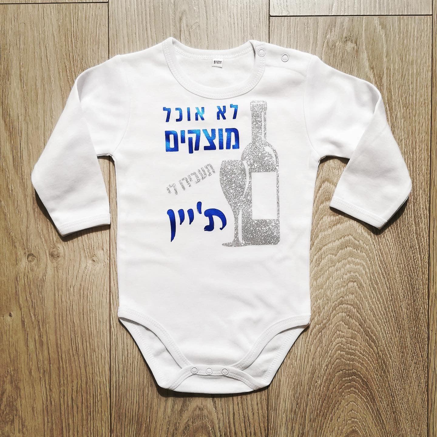 שולחן חג. כולם מסביב, המבוגרים מדברים, הצלחות מתמלאות ומתרוקנות, והבייבי הקטן יושב שם, מסתכל על כל השפע הזה, ובעצם אומר לעצמו: "נחמד כל האוכל הזה, אבל אני עדיין בתקופת הנוזלים". העיצוב הגאוני הזה, "לא אוכל מוצקים, תעבירו לי ת'יין", הוא התשובה המצחיקה והמדויקת למצבו. זהו בגד עם הומור הורי מתוחכם, שמתאים בול לארוחות חג, במיוחד בפסח ובראש השנה. הוא לוקח את המציאות של התינוק (שתפריטו מורכב בעיקר מחלב) ונותן לה טוויסט של מבוגרים. הבייבי הופך לדמות הכי מצחיקה בשולחן, זה שדורש את מה שכל המבוגרים רוצים, ועושה את זה בצורה הכי תמימה וחמודה שיש. דמיינו את סבא מרים כוסית רביעית בפסח, מסתכל על הנכד, וקורא את מה שכתוב לו על החזה. הצחוק מובטח. זו דרך לשבור את הקרח, להכניס קלילות לארוחה, ולהראות שיש לכם חוש הומור משובח. זה הבגד המושלם לתינוק שהוא הנשמה של המסיבה, עוד לפני שהוא יודע מה זה אלכוהול. וכדי שהבייבי יוכל להתמקד בבקשות שלו בנוחות מקסימלית, כל בגד שלנו מיוצר מ-100% כותנה ישראלית רכה ואיכותית. הבד נושם וידידותי לעור, וישמור על הנוחות שלו גם אם ארוחת החג תימשך עד השעות הקטנות של הלילה. הגזרה נוחה, הכפתורים פרקטיים, וההדפסה המצחיקה נעשית בעבודת יד בסטודיו שלנו. הצבעים עמידים ולא יתערבבו גם אם קצת מיץ ענבים (או יין, בטעות) יטפטף על הבגד. בסופו של דבר, זו המתנה המושלמת לחגים. היא מראה שהבייבי שלכם הוא חלק בלתי נפרד מההווי המשפחתי, ושיש לו כבר דרישות מאוד ברורות מהחיים.