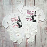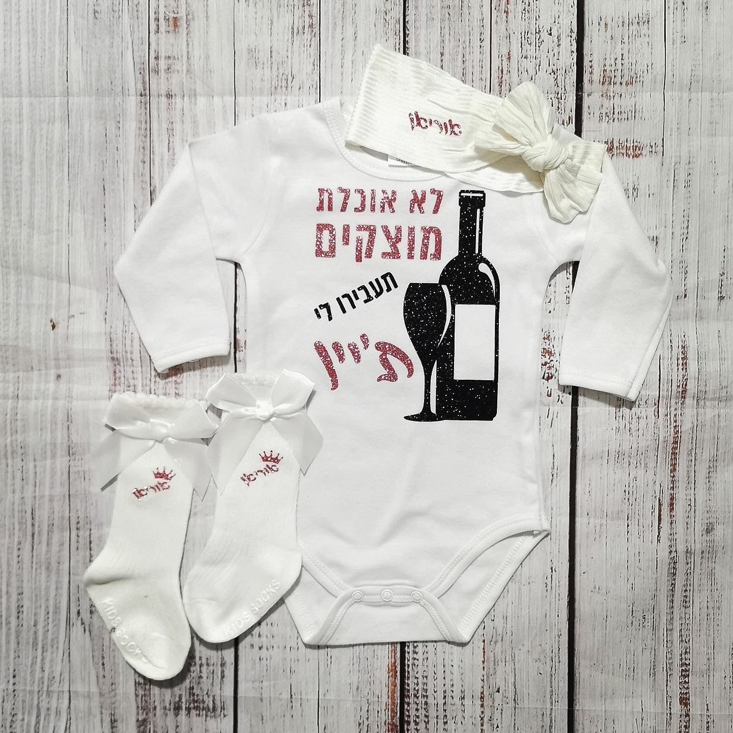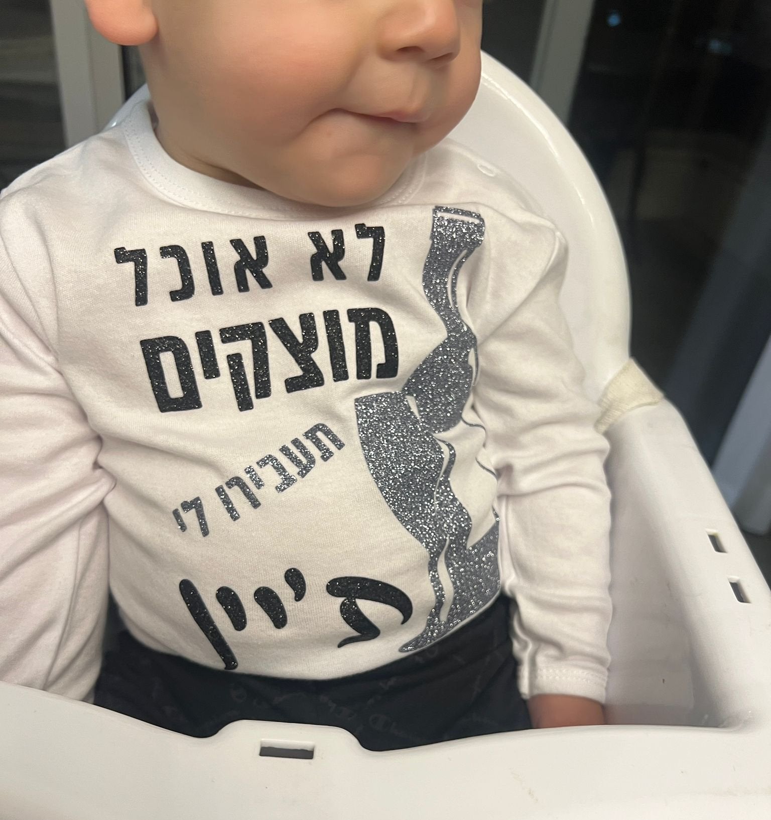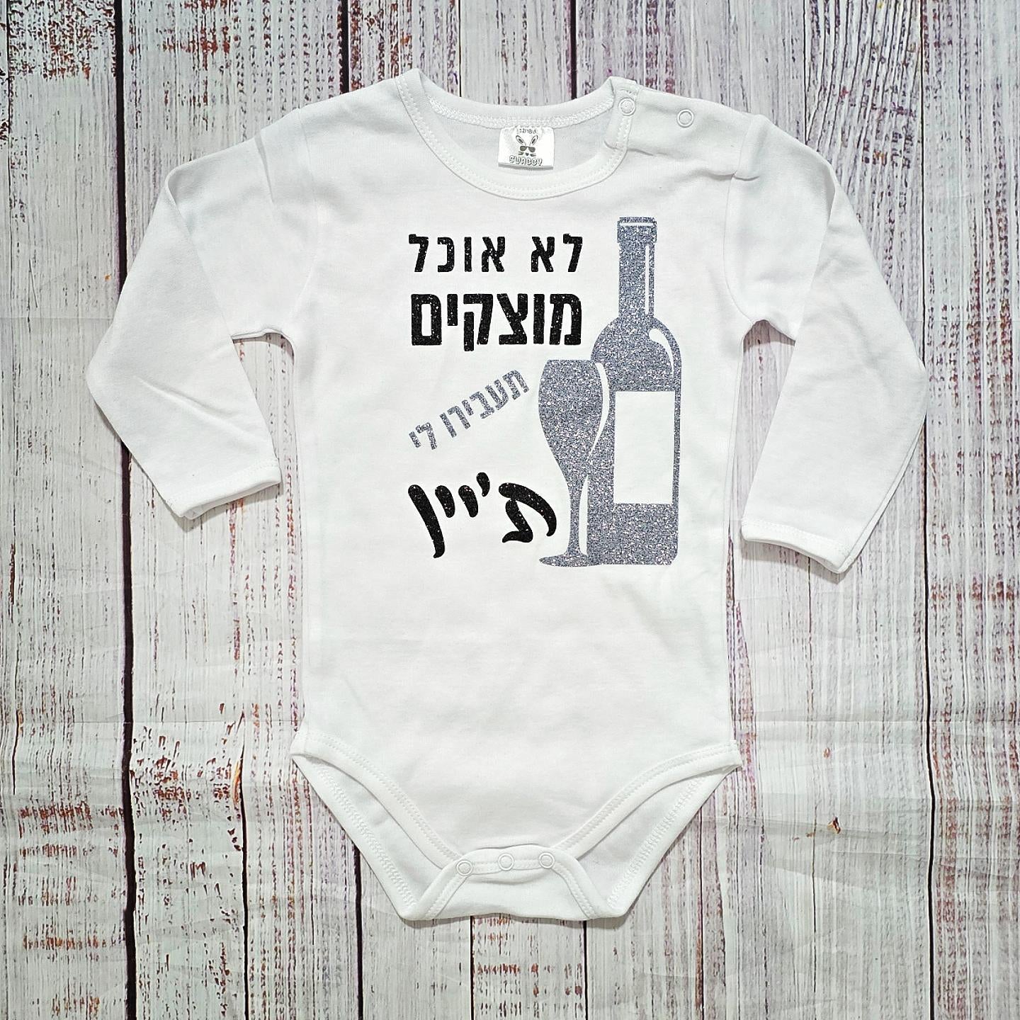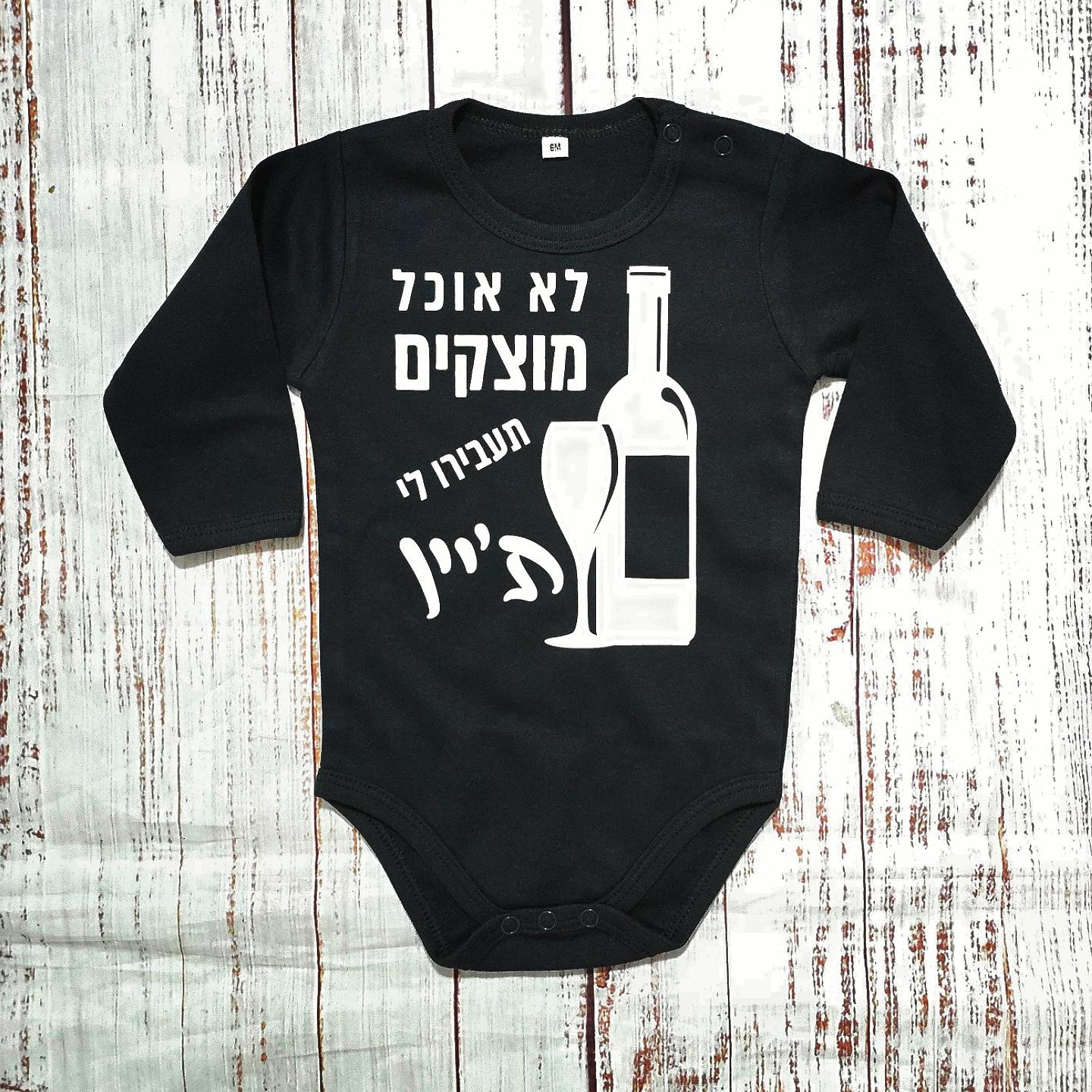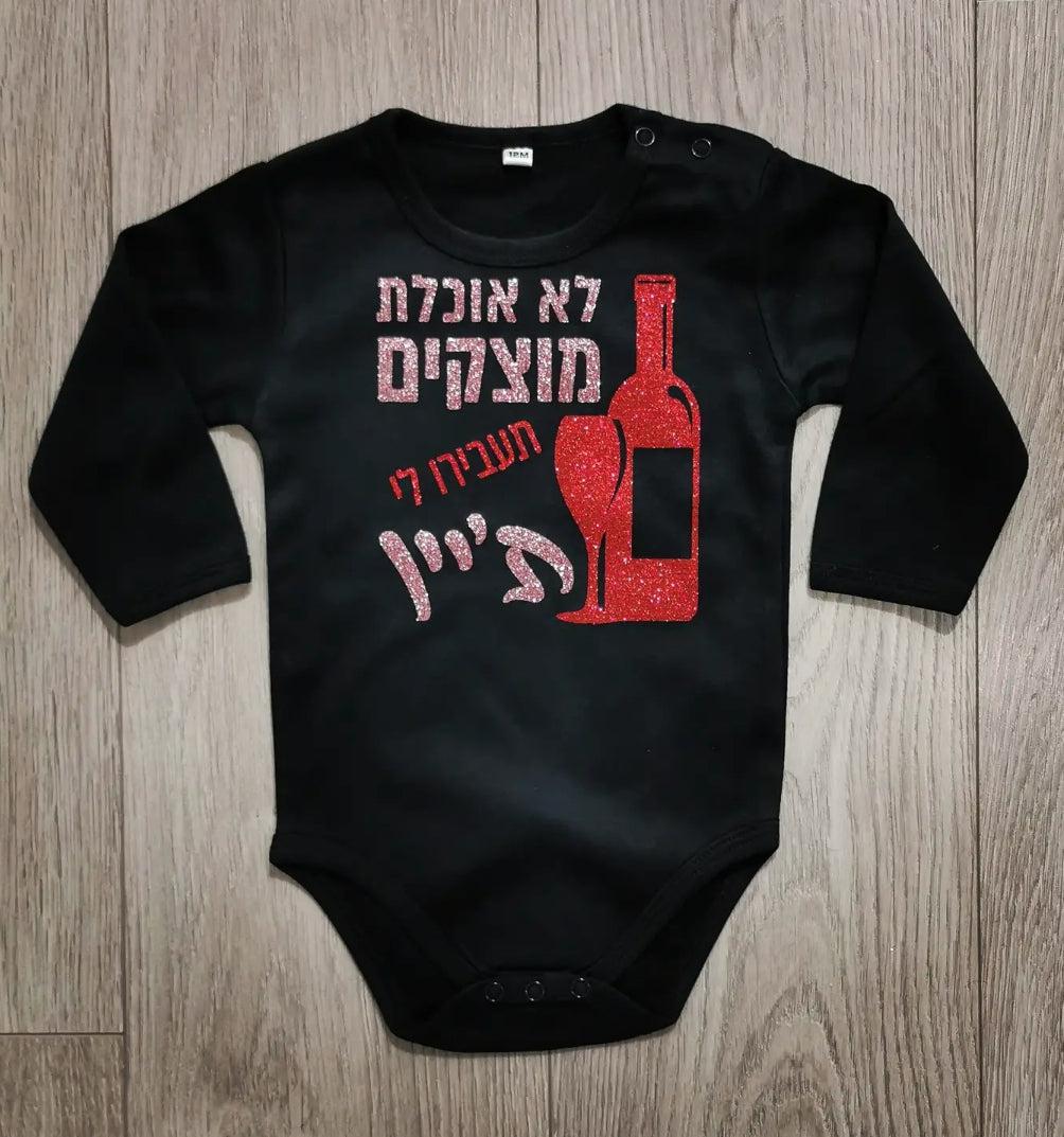 שולחן חג. כולם מסביב, המבוגרים מדברים, הצלחות מתמלאות ומתרוקנות, והבייבי הקטן יושב שם, מסתכל על כל השפע הזה, ובעצם אומר לעצמו: "נחמד כל האוכל הזה, אבל אני עדיין בתקופת הנוזלים". העיצוב הגאוני הזה, "לא אוכל מוצקים, תעבירו לי ת'יין", הוא התשובה המצחיקה והמדויקת למצבו. זהו בגד עם הומור הורי מתוחכם, שמתאים בול לארוחות חג, במיוחד בפסח ובראש השנה. הוא לוקח את המציאות של התינוק (שתפריטו מורכב בעיקר מחלב) ונותן לה טוויסט של מבוגרים. הבייבי הופך לדמות הכי מצחיקה בשולחן, זה שדורש את מה שכל המבוגרים רוצים, ועושה את זה בצורה הכי תמימה וחמודה שיש. דמיינו את סבא מרים כוסית רביעית בפסח, מסתכל על הנכד, וקורא את מה שכתוב לו על החזה. הצחוק מובטח. זו דרך לשבור את הקרח, להכניס קלילות לארוחה, ולהראות שיש לכם חוש הומור משובח. זה הבגד המושלם לתינוק שהוא הנשמה של המסיבה, עוד לפני שהוא יודע מה זה אלכוהול. וכדי שהבייבי יוכל להתמקד בבקשות שלו בנוחות מקסימלית, כל בגד שלנו מיוצר מ-100% כותנה ישראלית רכה ואיכותית. הבד נושם וידידותי לעור, וישמור על הנוחות שלו גם אם ארוחת החג תימשך עד השעות הקטנות של הלילה. הגזרה נוחה, הכפתורים פרקטיים, וההדפסה המצחיקה נעשית בעבודת יד בסטודיו שלנו. הצבעים עמידים ולא יתערבבו גם אם קצת מיץ ענבים (או יין, בטעות) יטפטף על הבגד. בסופו של דבר, זו המתנה המושלמת לחגים. היא מראה שהבייבי שלכם הוא חלק בלתי נפרד מההווי המשפחתי, ושיש לו כבר דרישות מאוד ברורות מהחיים.