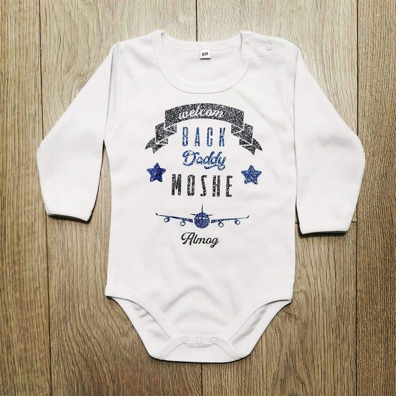 העיצוב "Welcome Back אבא" הוא לא סתם ברכה, הוא חיבוק ענק שאפשר ללבוש. הוא נוצר במיוחד עבור הרגעים המרגשים של האיחוד, בין אם אבא חוזר ממילואים, מנסיעת עבודה או מכל היעדרות ארוכה. זהו מסר פשוט, ישיר ועוצמתי של געגוע ואהבה. כשהבייבי מקבל את פניו של אביו לבוש בבגד הזה, זהו רגע של אושר טהור. הוא הופך לסמל החי של הבית והחום שאבא כל כך התגעגע אליהם. זוהי קבלת הפנים המרגשת ביותר שאבא יכול לבקש, כזו שממיסה כל עייפות ומרחק ברגע אחד.