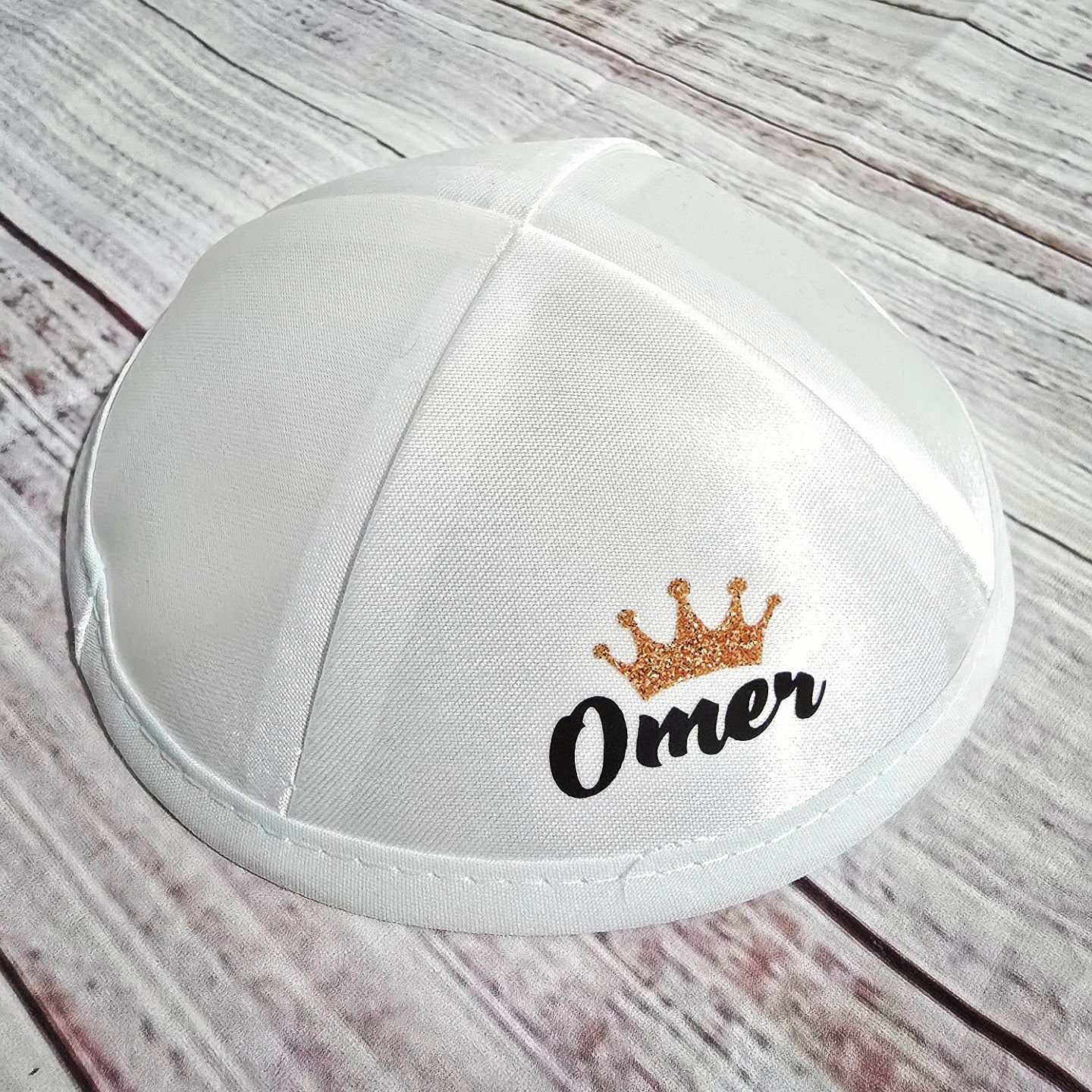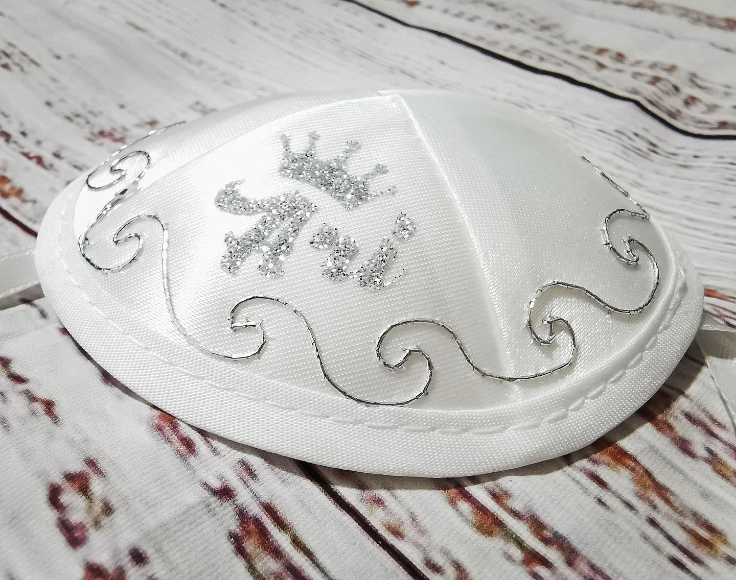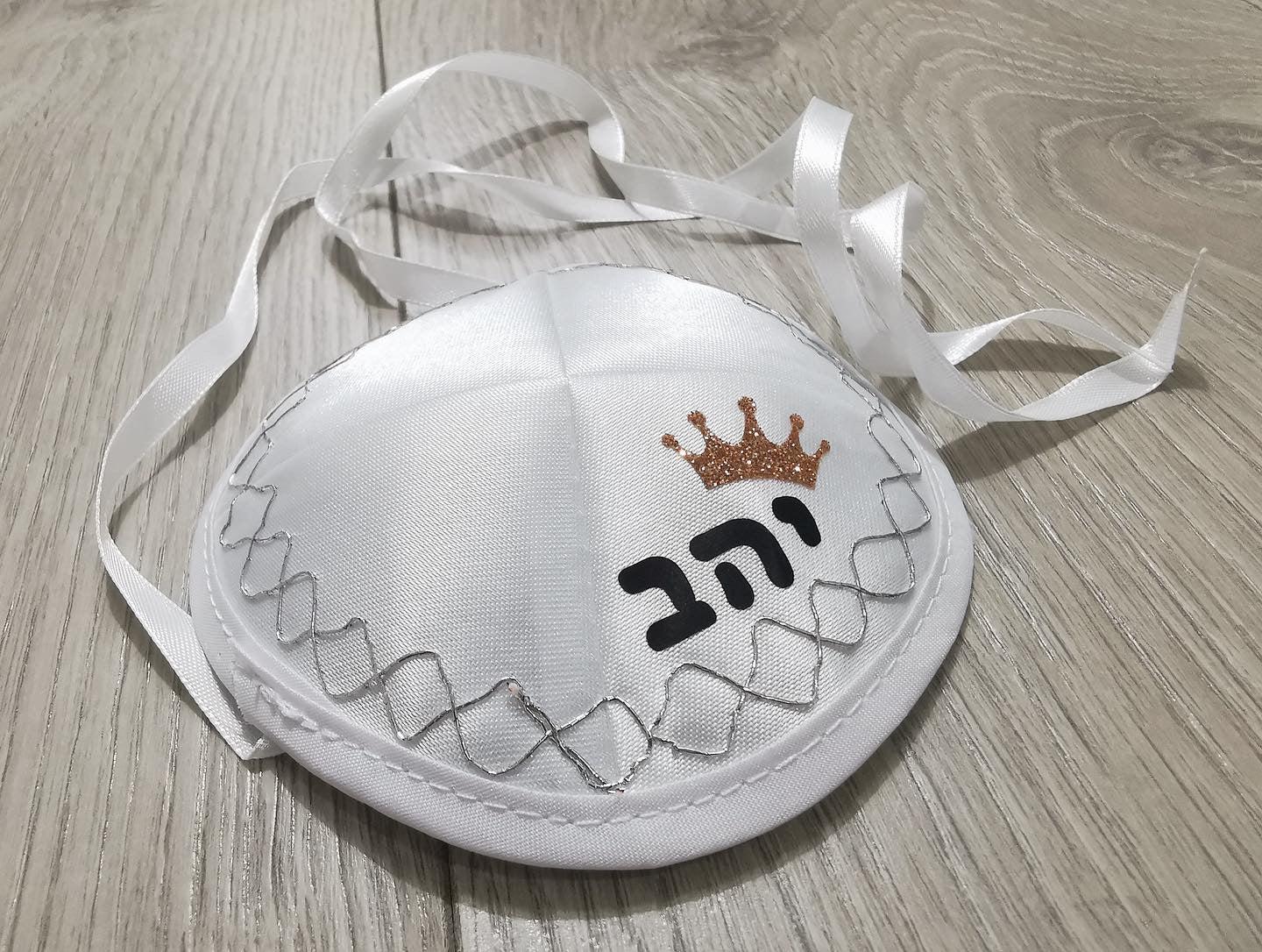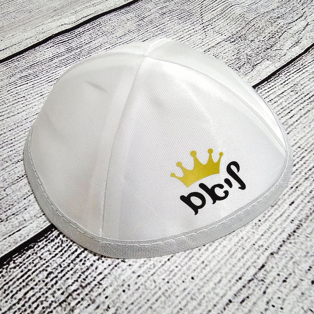 כיפת סאטן או בד פשתן איכותית ויוקרתית ב-3 מידות, לתינוקות, ילדים ומבוגרים, עם הדפס אישי ומיוחד של כיתוב וכתר בעברית במבצע לזמן מוגבל.