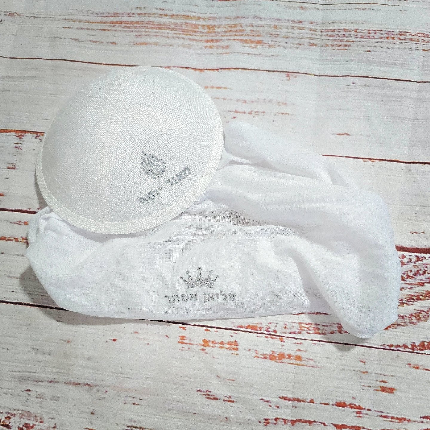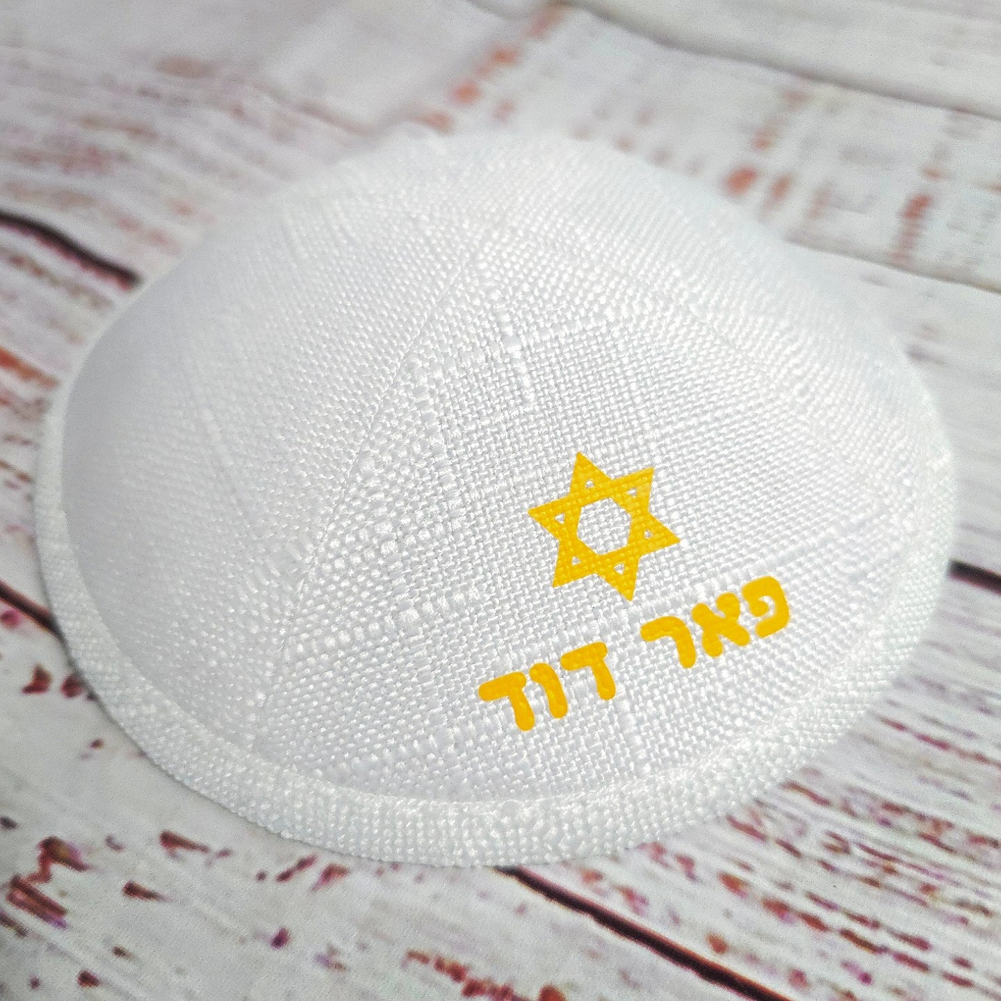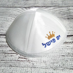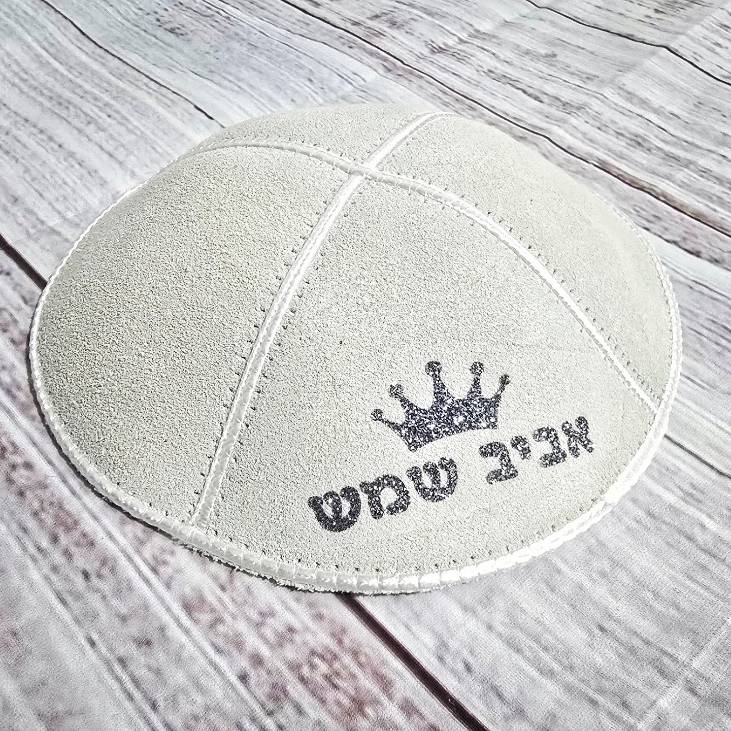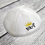 כיפת סאטן או בד פשתן איכותית ויוקרתית ב-3 מידות, לתינוקות, ילדים ומבוגרים, עם הדפס אישי ומיוחד של כיתוב וכתר בעברית במבצע לזמן מוגבל.