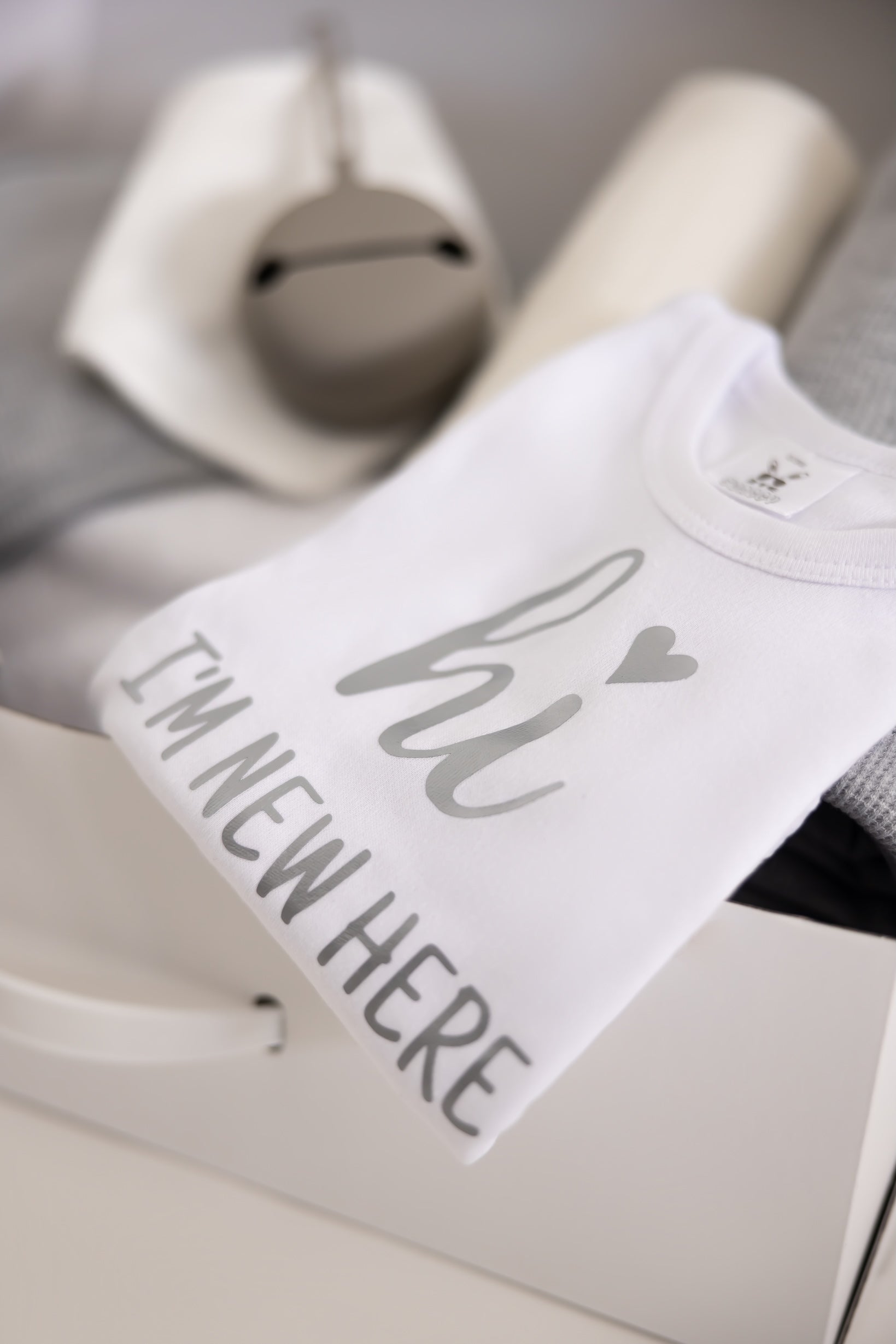 - בגד גוף אישי: עם הכיתוב המרגש " hi, I'M NEW HERE" אבל כמובן שתוכלו לבחור כל עיצוב ממבחר העיצובים שלנו! וכן, גם עיצוב אישי משלכם