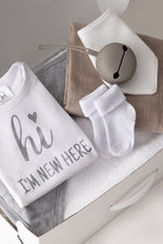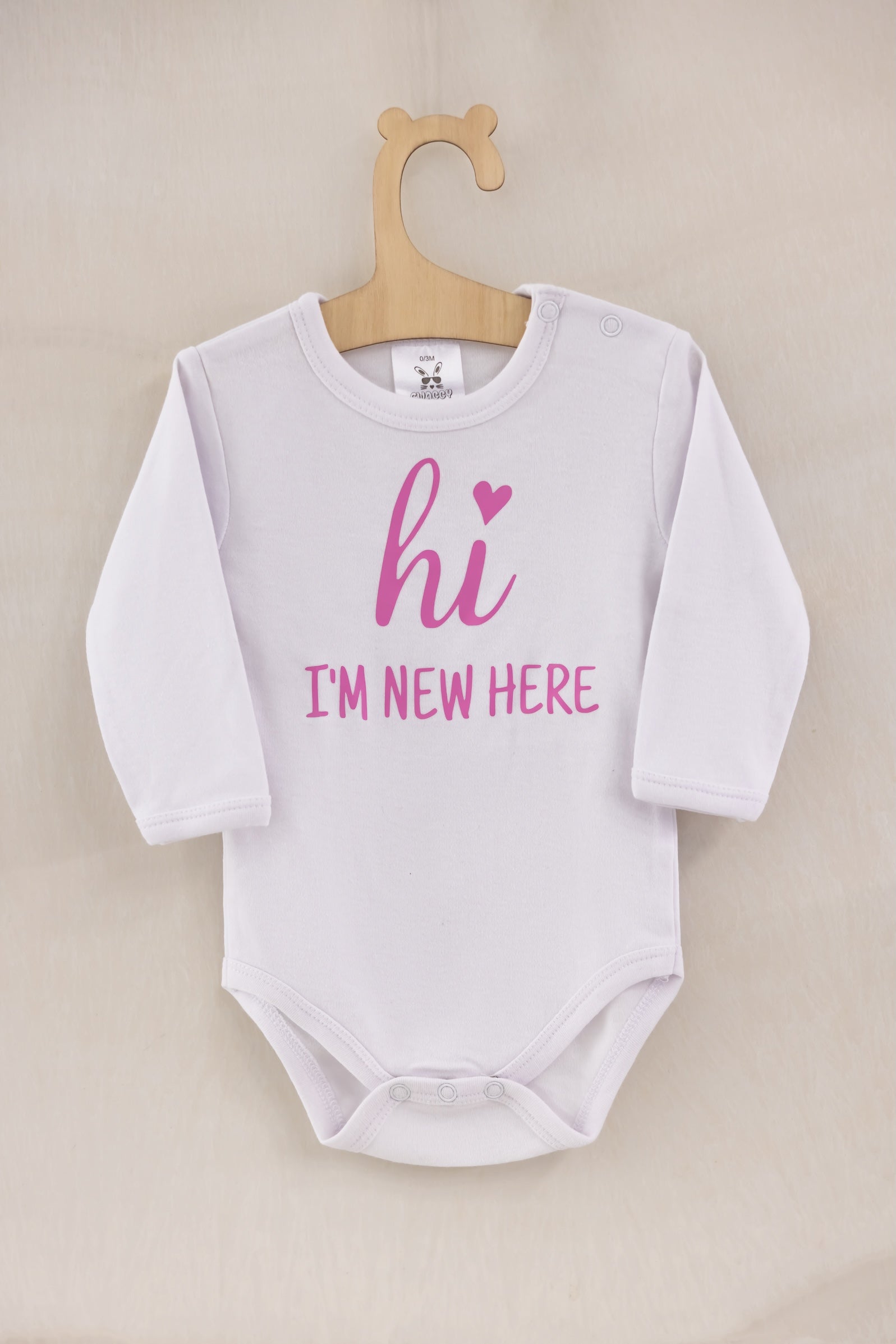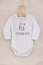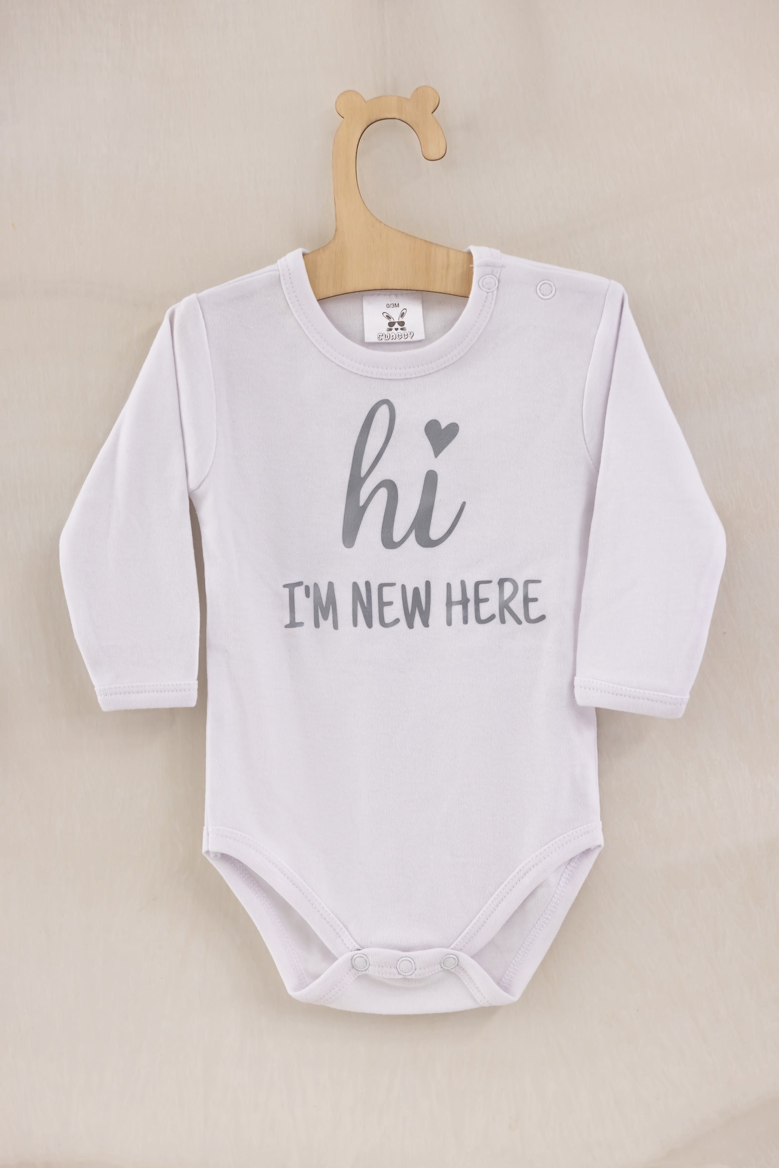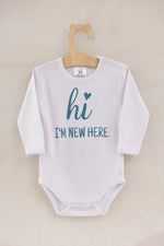 - בגד גוף אישי: עם הכיתוב המרגש " hi, I'M NEW HERE" אבל כמובן שתוכלו לבחור כל עיצוב ממבחר העיצובים שלנו! וכן, גם עיצוב אישי משלכם