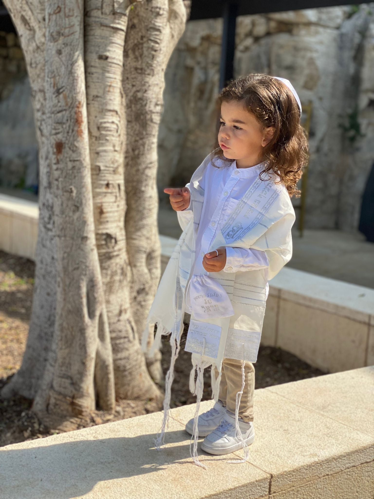 • הטלית במידה 125x35 ס"מ, גודל אידיאלי לעטוף ילד בן שלוש מבלי להכביד עליו.
