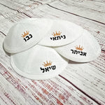 ארבע כיפות סאטן או בד פשתן איכותיות ויוקרתיות ב-3 מידות, לתינוקות, ילדים ומבוגרים, עם הדפס אישי של שם עם כיתוב וכתר במבצע לזמן מוגבל.