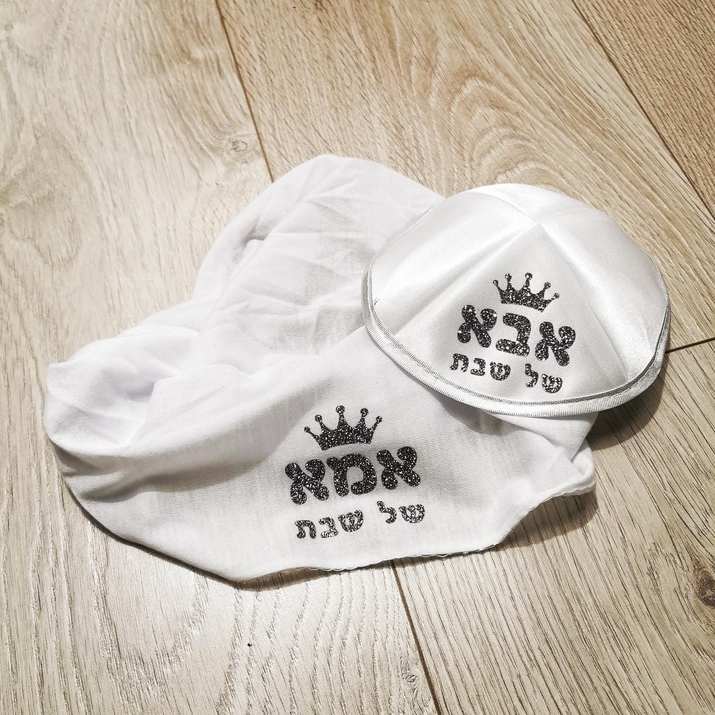 סט כיסוי חלה, כיפה ומטפחת אבא ואמא שבת