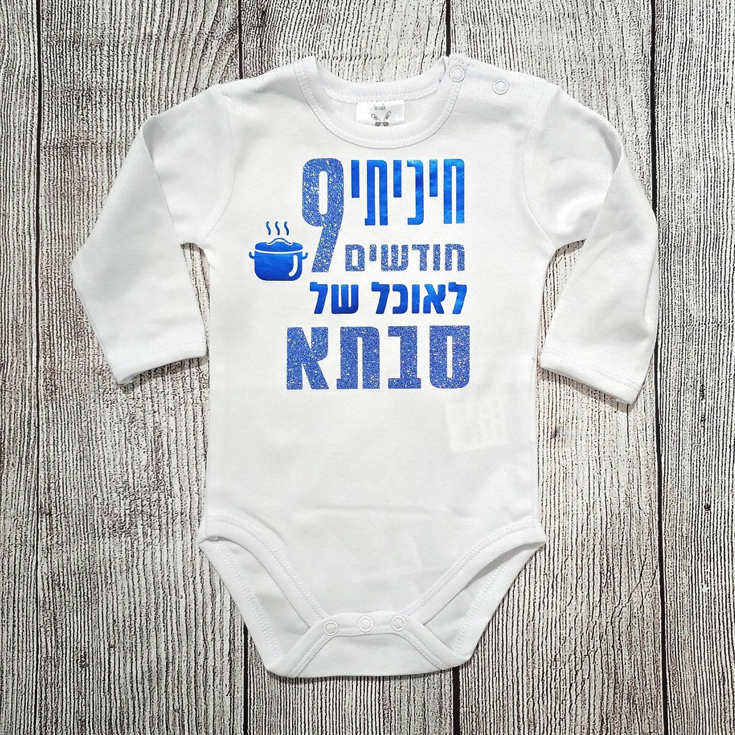 יש אגדה עתיקה, שעוברת מדור לדור, על כוחות קסם שיש רק לסבתות. הכוח להכין את הקציצות הכי טעימות, את המרק הכי מנחם, ואת העוגה שתמיד מצליחה. האוכל של סבתא הוא לא סתם אוכל, הוא זיכרון ילדות, הוא בית. והנכד או הנכדה החדשים? הם חיכו בסבלנות תשעה חודשים כדי להצטרף לחגיגה. העיצוב הזה, שניתן להתאמה אישית עם שם הסבתא, הוא מחווה מרגשת ומשעשעת לאישה והאגדה. הוא אומר בשם הבייבי: "חיכיתי המון זמן, עברתי דרך ארוכה, והכל כדי סוף סוף לטעום מהדבר האמיתי הזה שכולם מדברים עליו - האוכל שלך, סבתא!". זו המתנה המושלמת ליום ההולדת של סבתא, או סתם כדי להגיע איתה לארוחת שישי ולגרום ללב שלה להתרחב מגאווה ומתיקות. זה הרגע שבו היא תבין שהמוניטין הקולינרי שלה עבר גם לדור החדש, ושהיא צריכה להתחיל להכין סירים גדולים יותר. זה מצחיק, זה אישי, וזה מחזק את הקשר הבין-דורי המיוחד הזה. כמובן, בזמן שהבייבי מחכה בסבלנות למנה הראשונה שלו (שכנראה תהיה גרבר, אבל אל תגלו לו), חשוב שיהיה לו נוח. כל בגד כזה עשוי מ-100% כותנה ישראלית סופר-רכה, שתאפשר לו לחלום על קוסקוס בנוחות שיא. הגזרה מתוכננת לחופש תנועה, וההדפסה האישית נעשית בעבודת יד ובאהבה אצלנו בסטודיו. אנחנו מקפידים על כל אות בשם של סבתא, ומשתמשים בצבעים איכותיים שישרדו גם כתמים של רוטב עגבניות. בסופו של דבר, זו המתנה הכי טעימה שאפשר לתת לסבתא, בלי להכניס קלוריה אחת. זו הצהרת אהבה, הערכה, ובעיקר - ציפייה גדולה לארוחה הבאה.