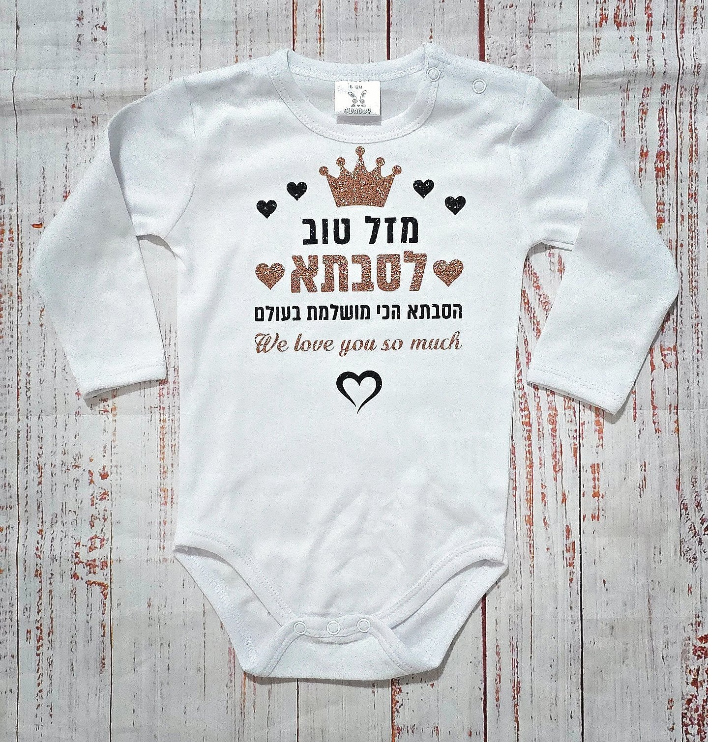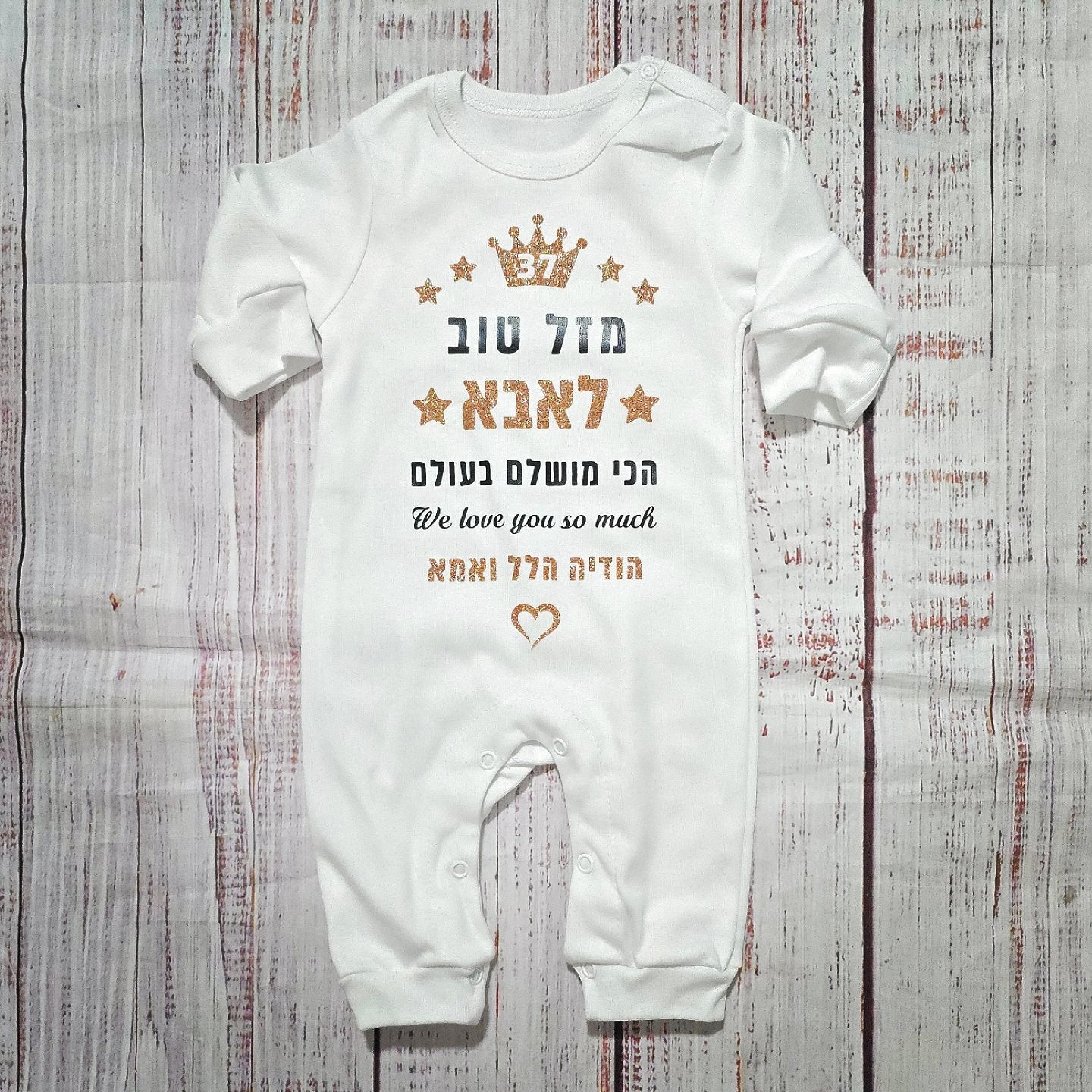 אהבה לא תמיד צריך להסביר. לפעמים מספיק מבט קטן, חיוך עקום או יד קטנה שמונחת על הכתף - וכל הלב נמס. עיצוב "מזל טוב - We love you so much" נולד בדיוק בשביל הרגעים האלה: אותם רגעים פשוטים אבל כל כך גדולים, שמציפים אותנו באושר טהור. בין אם אתם מחפשים להפתיע את אבא, סבתא, אמא או אפילו את הדוד המגניב, אין דרך יותר כנה ומתוקה לומר "אנחנו אוהבים אותך בטירוף" מאשר לתת לקטנטן שלכם ללבוש את זה בגאווה. כי כשמילים לפעמים קטנות על כמה שאנחנו אוהבים - תינוק מחייך עם בגד כזה אומר הכל, בלי להוסיף מילה. בואו נודה בזה - אפשר ללכת על מתנה קלאסית כמו פרחים, בושם או ארוחה במסעדה. אבל תינוק קטן שמכריז "We love you so much" על הבטן המתוקה שלו? זה רגע שלא מחליפים בשום דבר אחר. זו לא סתם עוד מתנה - זו מזכרת, רגש, וצילום שיככב באלבום המשפחתי עוד הרבה שנים קדימה. והרגע שבו הבייבי שלכם, החמוד שבחבורה, הופך להיות שליח האהבה הרשמי של היום הולדת? זה רגע שכולם יזכרו, הרבה אחרי שייגמרו הברכות והכיבוד. ומה עם הבגד עצמו? כאן לא מתפשרים. כל בגד גוף או אוברול שלנו מיוצר בעבודת יד מלאה, ממש כאן בישראל, תוך הקפדה על כל תפר וגימור קטן. אנחנו עובדים רק עם 100% כותנה סרוקה אמיתית - רכה, נושמת ונעימה במיוחד לעור העדין של התינוקות. הבדים מתאימים בצורה מושלמת למזג האוויר הישראלי - קיץ, חורף ועונות מעבר כאחת - כדי להבטיח נוחות מקסימלית בכל יום ובכל מצב. הגזרות שלנו מחושבות לפרטי פרטים, בלי תפרים מגרדים, בלי תוויות מציקות ובלי פשרות על איכות או נוחות. כל הדפס עובר אצלנו טיפול אישי - נעשה בעבודת יד בסטודיו שלנו, בצבעים מיוחדים, עמידים ומבריקים או מנצנצים (אם בא לכם להוסיף קצת וואו). והכי חשוב? ההדפסים שלנו לא מתקלפים, לא דוהים ולא מתפרקים - גם אחרי עשרות ואפילו מאות כביסות (כן, אנחנו מכירים את קצב הכביסות של הורים 😉). כי כשאנחנו אומרים "We love you so much" - אנחנו מתכוונים לזה גם באיכות, גם בחוויה, וגם בלב.