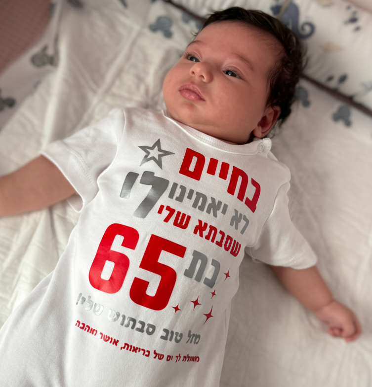 כמו כל הבגדים שלנו - גם כאן מדובר באיכות הכי גבוהה שיש: 100% כותנה סרוקה, תפירה מושלמת, מתאימה במיוחד לתינוקות ולמזג האוויר הישראלי. הכל מיוצר בישראל, בעבודת יד מלאה בסטודיו שלנו, באהבה ענקית וליטוש של כל פרט קטן. אם אתם מחפשים דרך מרגשת, מצחיקה ואישית לומר "מזל טוב" ולגרום לכולם לעצור ולהגיד "וואו" - הגעתם בדיוק למקום הנכון.